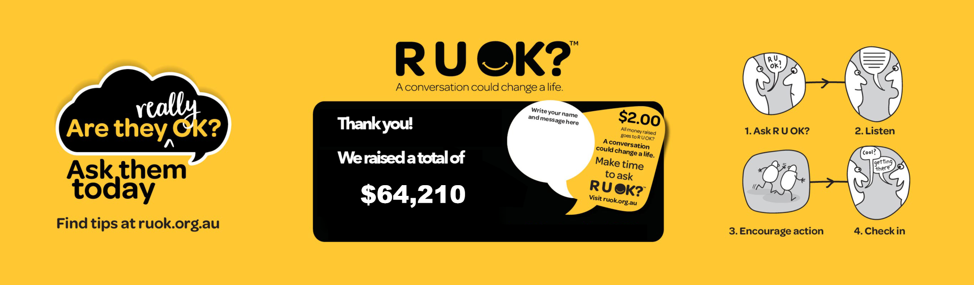 Thanks to the efforts of our store teams and of course our amazing customers we were able to raise a total of $64,210 for the RUok foundation. 100% of these funds go to the RUok foundation to help them continue their work, and in-turn help as many people as possible.