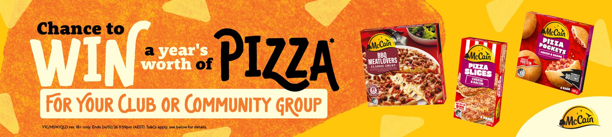 Buy any 2 Pizzas from the McCain Range and fill out the form below for a chance to win a years worth of Pizza for your club or community group.