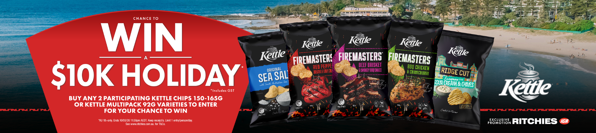 3.1 Ritchies Kettle promotion commences on Wednesday 11th February 2026 at 7.00 am (AEST) and concludes Tuesday 10th March 2026 at 21.00 (AEST). To be eligible to enter individuals must purchase any 2 x Kettle Chips 150-165g, Kettle Multipack 92g Varieties in the one transaction in-store at any participating Ritchies during the promotional period, scan the QR code or visit the website https://www.ritchies.com.au/Snackbrands-consumer-promotion & complete the online entry form no later than Tuesday 10th March 2026 at 21.00 (AEST). Incomplete or indecipherable entries will be deemed invalid.