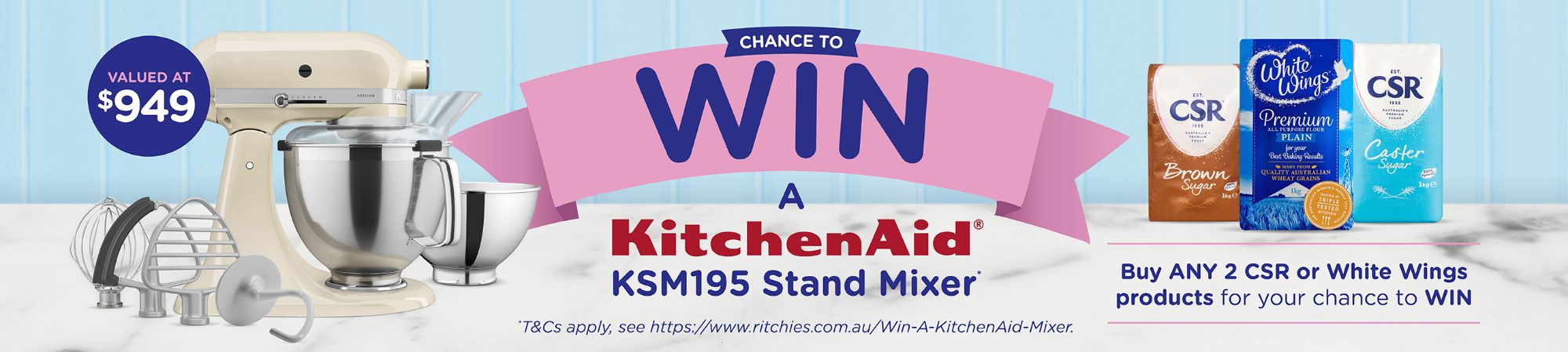 a) Purchasing any 2 CSR or white wings products at any particiapting Ritchies Supermarket during the promotional period and completing the entry form via the link available at https://www.ritchies.com.au/Win-A-KitchenAid-Mixer