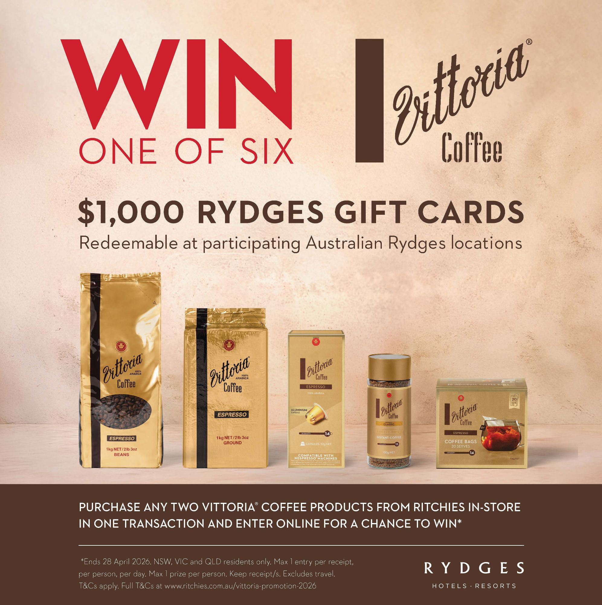 Purchase any two Vittoria coffee products from Ritchies in-store in one transaction and win 1 of 6 $1,000 Rydges gift cards.