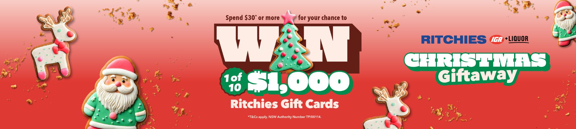 All the winners will be published to https://www.ritchies.com.au/christmas within 5 business days of the draw. Daily prize will be delivered as a Ritchies Digital Gift Card to the customer’s phone.
