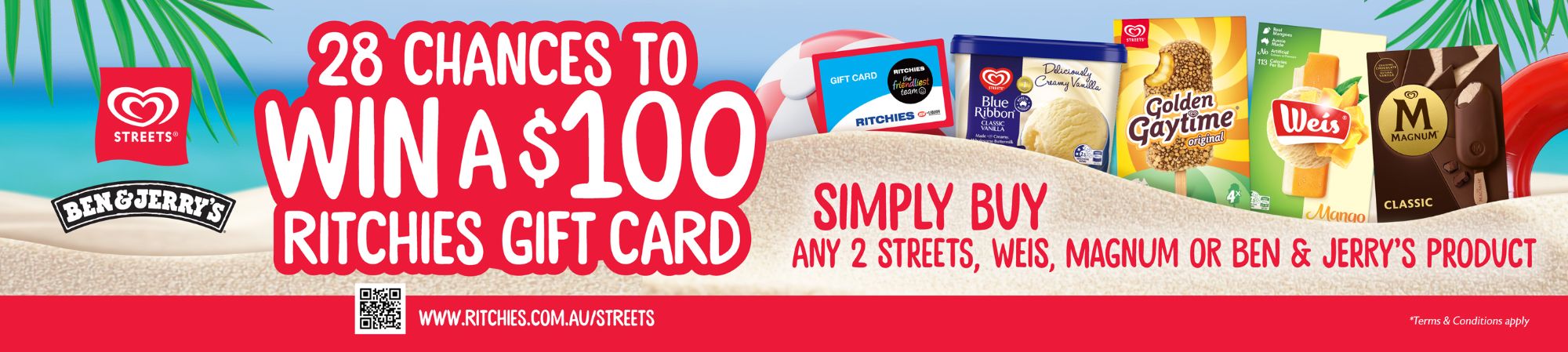 Winner will be published to https://www.ritchies.com.au/streets within 5 business days of the draw. The prize will be sent to the Ritchies Supermarket selected by the winner at the time of entry for collection.