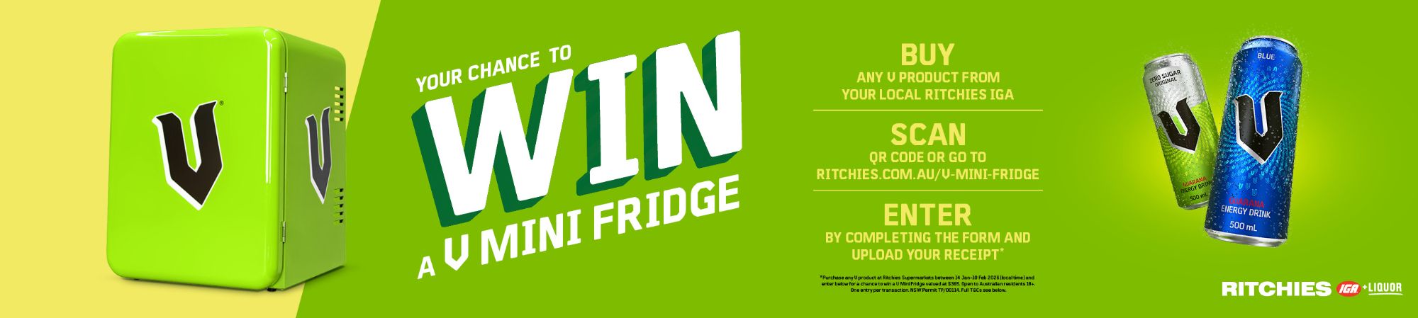 Enter for your chance to win by purchasing any V product from local Ritchies Supermarket during the promotional period and completing the entry form below.